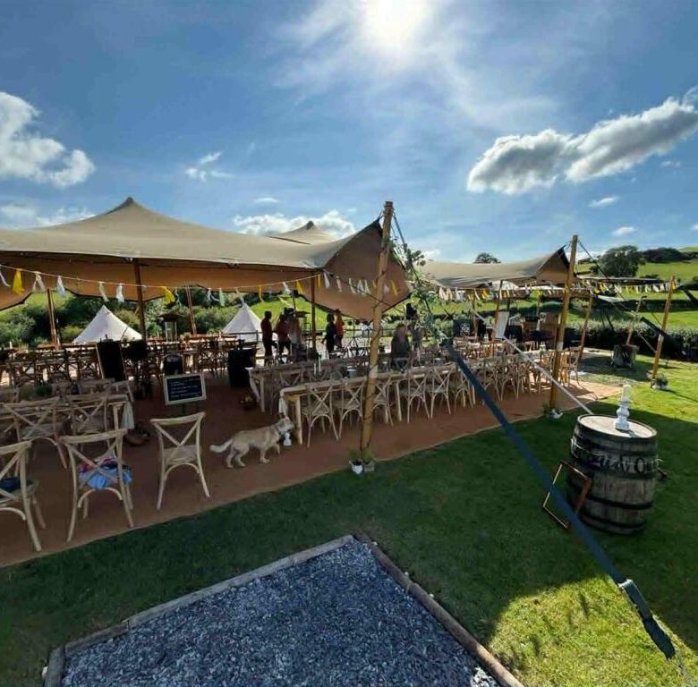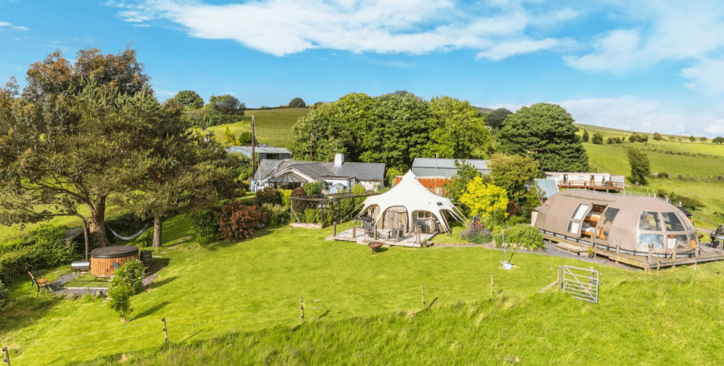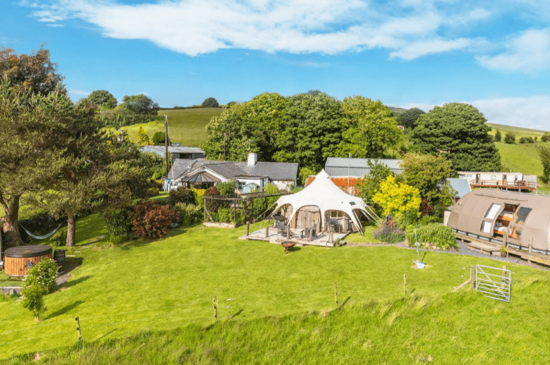 Luxury Glamping Business – Superb established glamping site to include three units together with outside covered eating and seating area, outside kitchen, shower rooms, washing and toilet facilities. The guests have use of BBQ area, outside kitchen and pizza oven.