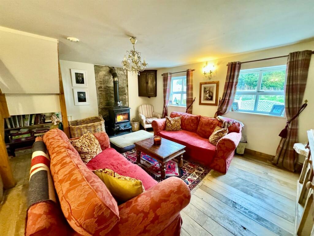 Lounge: – 4.56m x 4.8m (14’11” x 15’8”) – Oak flooring; cast iron glazed fronted log burning stove on slate hearth; two sealed unit double glazed windows overlooking front; radiator; TV point; telephone point; stable side door.